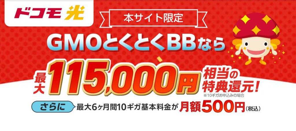 GMOとくとくBBは、ドコモ光の申し込み窓口の中でキャッシュバック額が最高水準のプロバイダです。